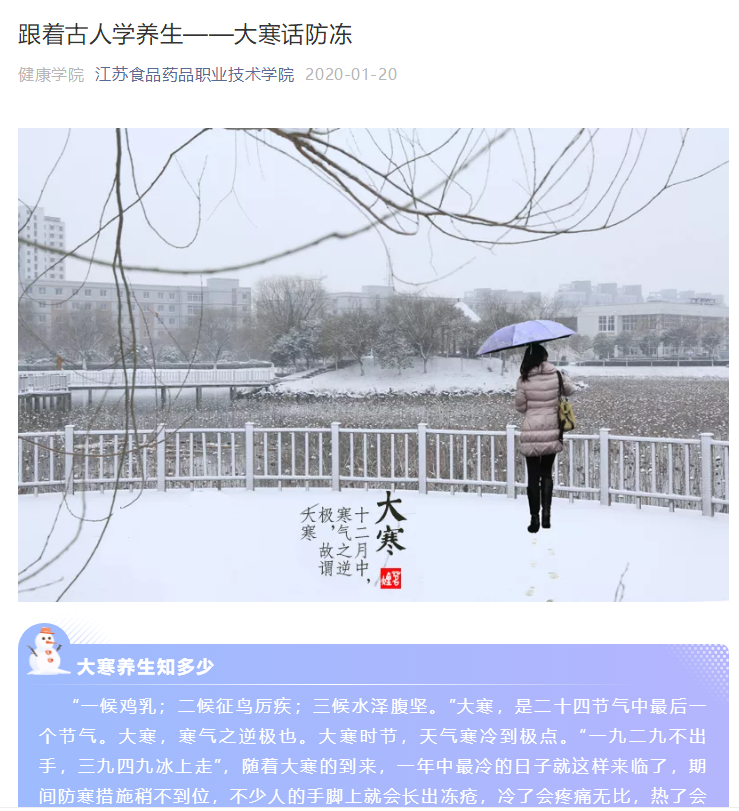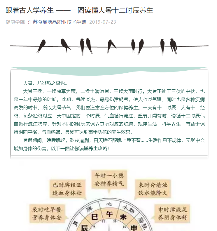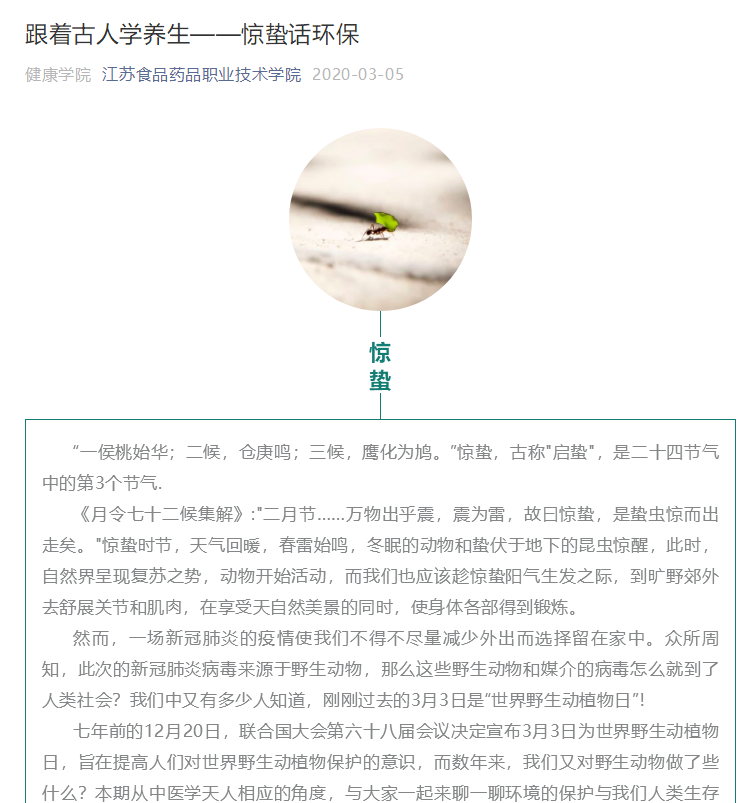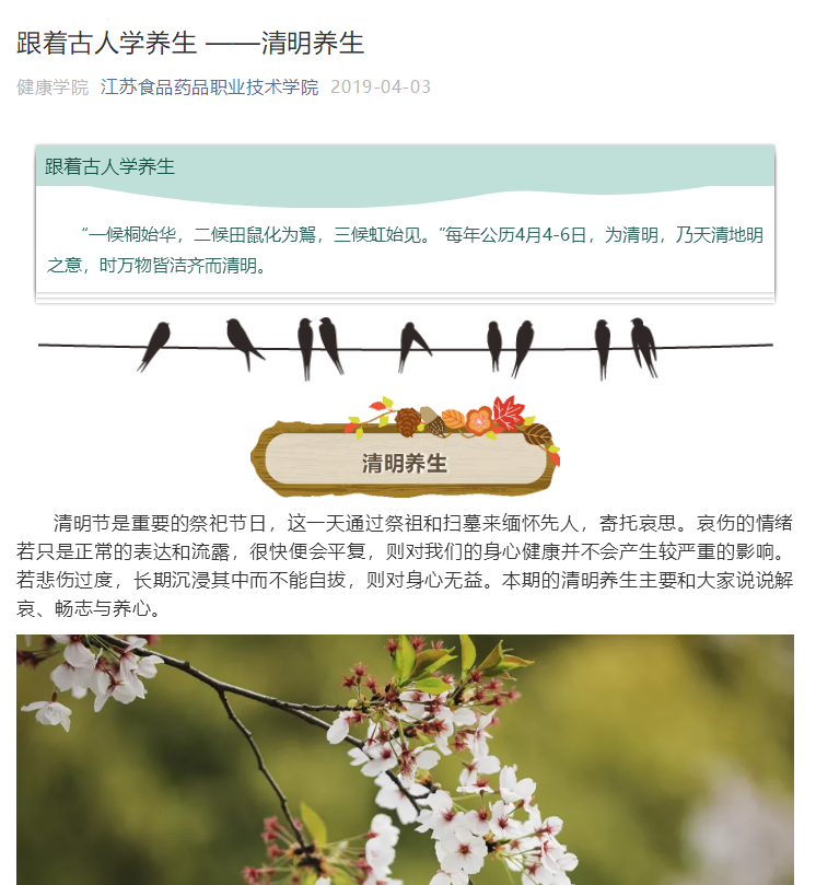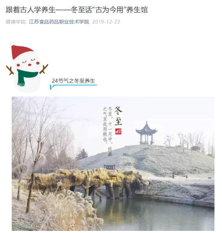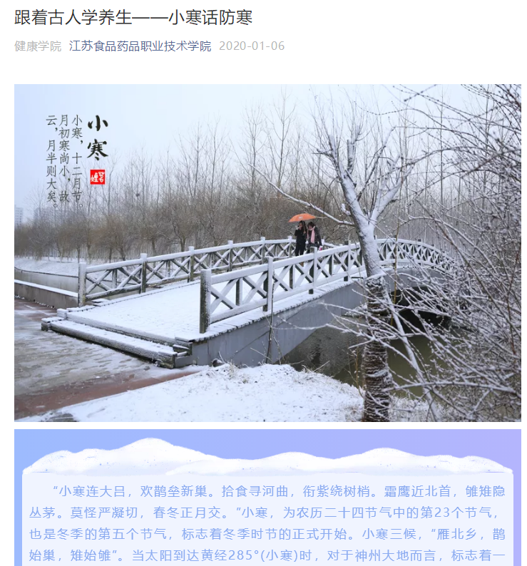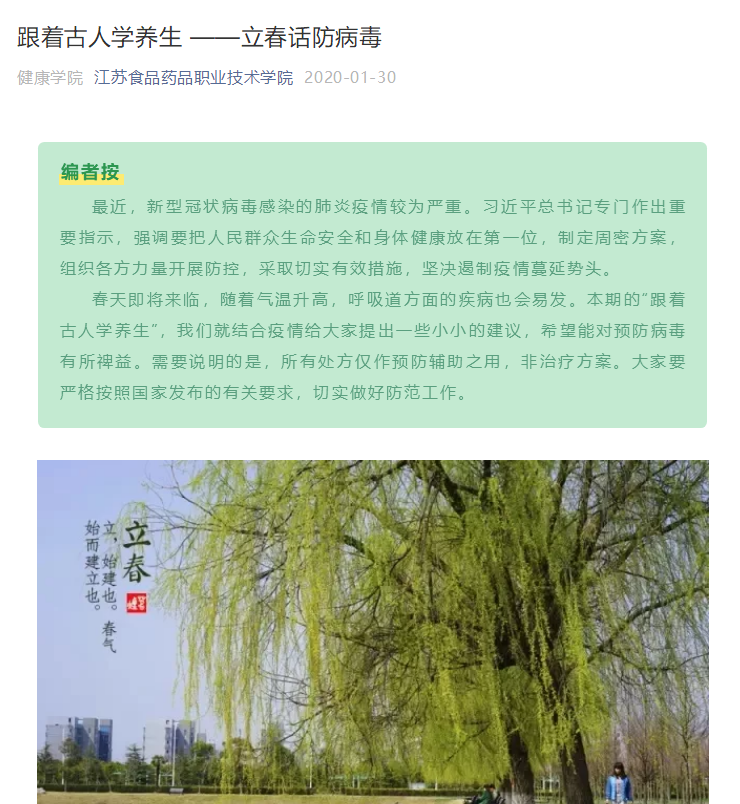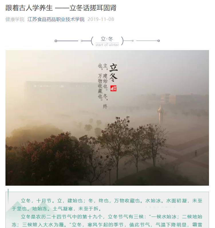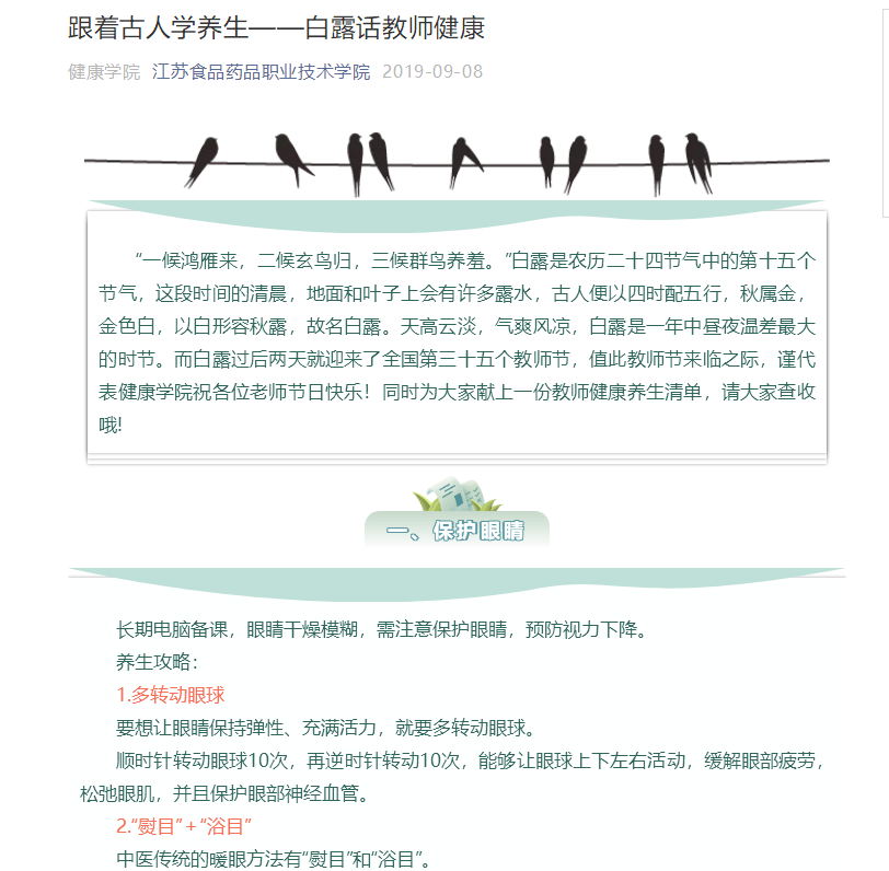 《跟着古人学养生》专栏的推文都是层层把关,多次修改完善后推出的。文章素材选择方面,遵循时间原则,以二十四节气为时间节点,以中医学专业知识为基础,选择与师生关系密切、关注度高的文章素材。文章标题制作上,标题与文意相符,题文统一,长短适当,准确、具体、生动。文本内容的撰写,采用短句子,短段落写作结构,便于读者利用碎片化时间阅读。策划、撰稿、编辑人员不但有较高的专业素养,熟悉文字编辑、图片处理、视频制作等基本业务,同时也具备较高的思想政治觉悟,明确自身的责任和使命。