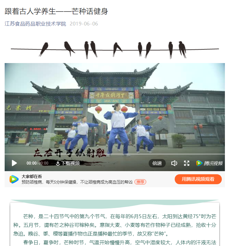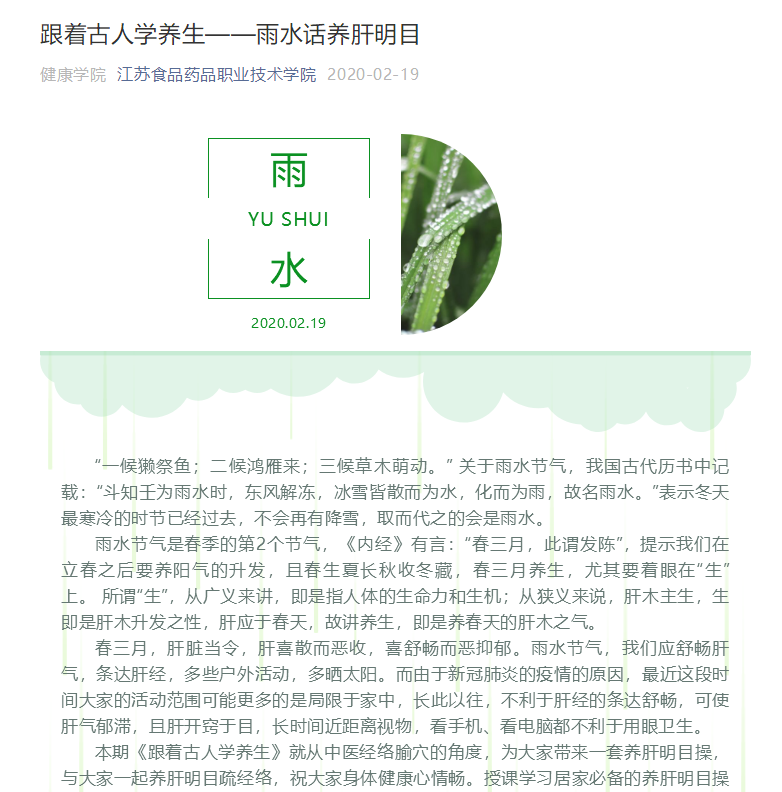 “芒种话健身”推出了健康公司改编的八段锦养生操,在员工群体中形成了健康养生浪潮。“立春话防病毒”结合今年年初新冠肺炎严重疫情与大家一起讨论如何从中医的角度认识、防控新型冠状病毒感染的肺炎。“雨水话养肝明目”结合疫情期间教师网课授课,员工网课学习的情况,从中医经络腧穴的角度,为大家带来一套居家必备的养肝明目操。