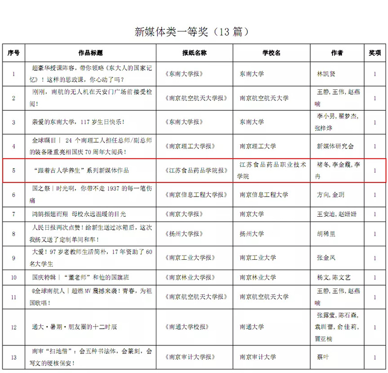 江苏省高校优秀作品分消息、通讯、言论、版面、新闻摄影、文学、新媒体七个类别。在七个类别的作品评选中,荣获一等奖的高职院校仅公司一所,这也是自参加评选以来公司获得的第一个一等奖。