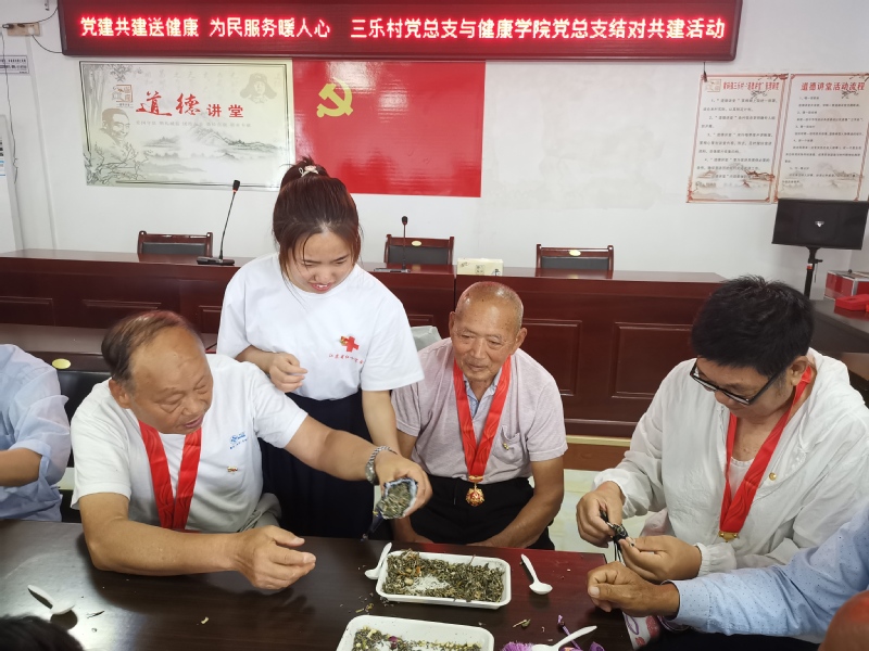首先,青年党员教师孙嘉逸向三乐村全体党员做了《夏季养生》主题讲座。孙老师从气、血、津、起居、饮食等几个方面向老党员介绍了夏季养生的特点及养生原则。随后,中医养生保健、中医康复技术专业员工党员向老党员介绍了常见中草药的功效,并和老党员们一起制作了具有安神、驱蚊等功效的中药香囊。康复203班陈乐同学教授老党员们习练了《八段锦》健身操,受到了老党员们的一致称赞。最后,总支党员和获授“光荣在党50年”老党员进行合影留念。