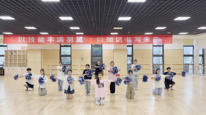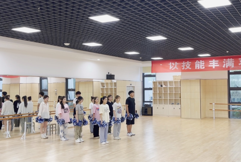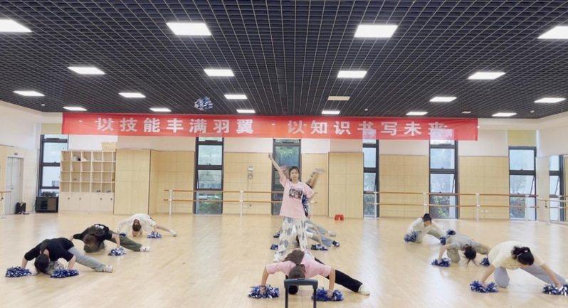 大二的学长学姐们边兼顾学业,边带领大一队员学习健美操和啦啦操。大一队员们多数来自不同的班级,刚开始是几乎没有默契可言的。学姐带大一队员对着镜子分组练习,培养默契。我们院此次的团队从一开始的散乱慢慢也有了一个整体的样子。辅导员杨韵老师更是非常专业,在繁忙工作的同时,很关注队员们,经常来陪队员训练,也一眼就能看出队员的问题所在。前期大一队员虽然把动作都做出来了,但是缺乏了力量,健美操和啦啦操注重的是青春活力,力量感是非常关键的。杨韵老师带着队员们一拍一拍地扣动作,并激励队员,亲自给队员们示范动作,告诉队员们表情也是非常重要的一项,微笑是非常能感染大家的。