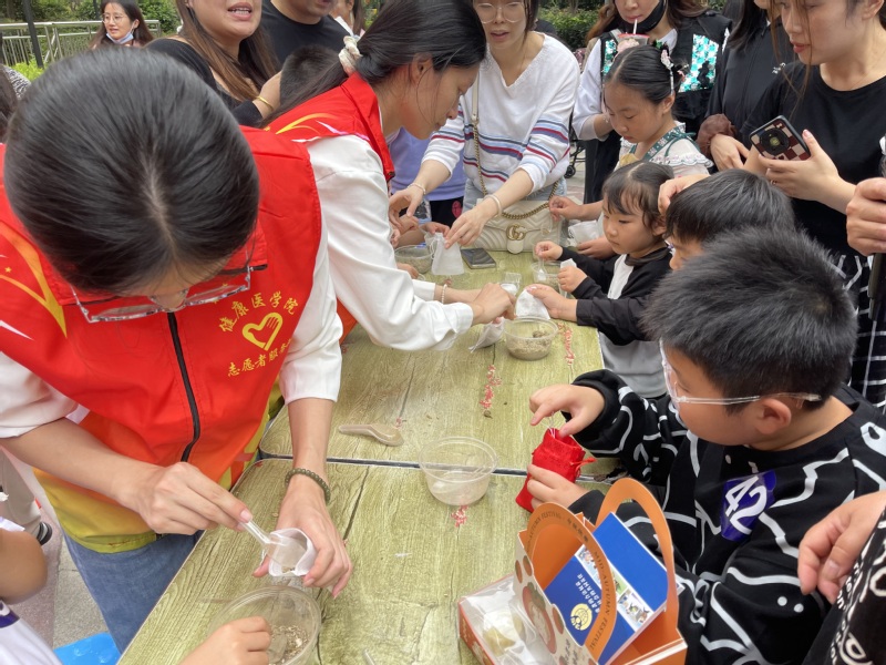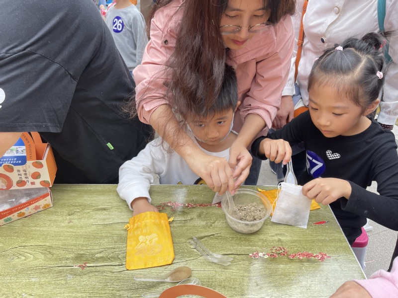 其次是“巧手制香囊”,在这金秋好时节,志愿者们准备了四味中药材,分别是艾叶、薄荷、丁香、藿香小小中药材集合起来就具有了芳香避讳、提神醒脑、防蚊驱虫功效。但需注意的是,本款带有功效的中药材香囊不适合家里有身孕的人使用。中药材味道浓烈,有的微苦,有的甘甜。一开始小朋友们都在讨论这些味道新奇的中药材,三五个围在一起讨论着说以前从未见过,而后又一拥而上,将制作香囊的工作台围得水泄不通,纷纷抢着举手说要做香囊,活动现场十分热闹。