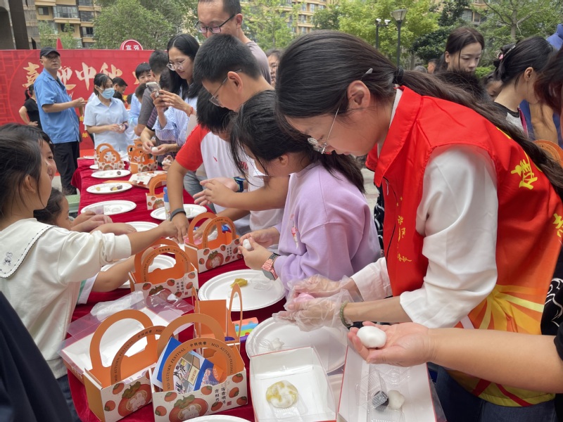 首先是“巧手做月饼”,月饼作为中秋节的节令食物,既象征着天上的圆月,又从侧面反映出了人们期盼团聚的美好愿望。活动现场从月饼馅、冰皮以及模具上的数量清点等前期准备工作开始就已经热闹非凡,也十分受欢迎。除了本次报名参加活动的50组家庭外,还吸引到了其他社区的小朋友们前来参加。我们为小朋友们准备了丰富的月饼馅,有豆沙、绿豆、蛋黄肉松等。饼皮上,也选择了更为口感细腻的原材料而制成。大家按照步骤取皮、放团馅,然后整理形状再放入模具,最后轻轻压一压,一款款独特并充满浓浓情谊的月饼就在他们的手中完成了,整个活动现场欢声笑语,其乐融融。制作好的月饼香香甜甜,一口一个幸福,一口一个团圆。