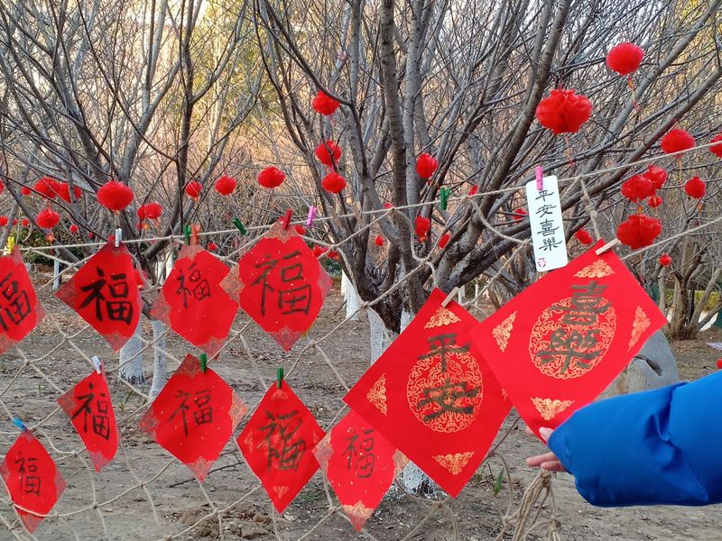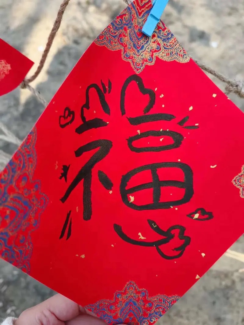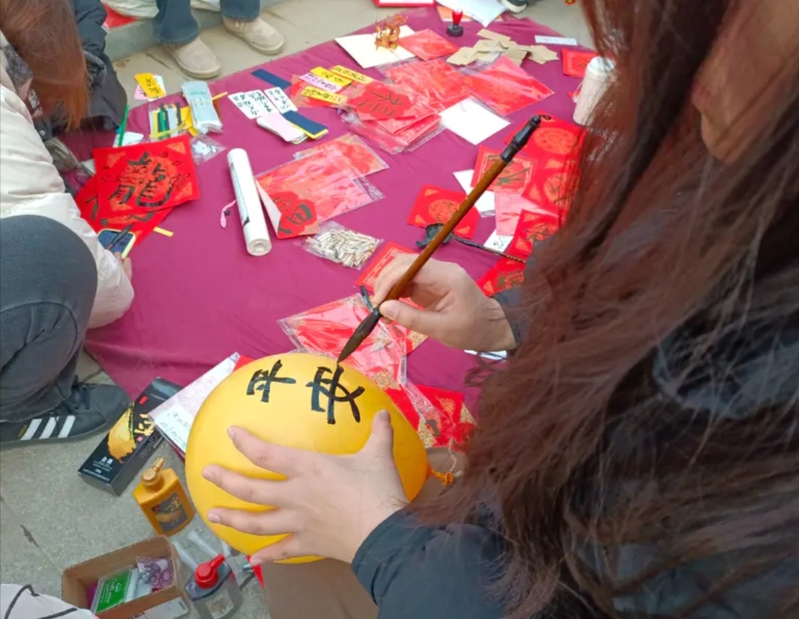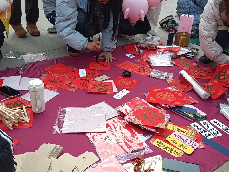 游园一的春节区域,分别有剪纸、书签设计、写春联和写福等文字类的传统活动体验,其中写福字的活动区域是最受欢迎的,人流量通常是挤得水泄不通,有的同学“一心一意”排队了一次又一次,就是为了能再多写几张福字带回去贴在衣柜和寝室大门上。而有的同学,纵使旁边的人换了一波又一波,依旧稳如泰山地还没写完一个福字,你若是上前询问他,反倒被打趣道“艺术创作,不可说,不可说”。文字类的活动结束,还会给大家提供扭扭棒材料,让大家自行进行艺术创作使用。文艺类的活动结束后,还有五子棋、鲁班飞鸟风筝、投壶、滚铁环等传统运动让大家锻炼身体的同时,又能有益于身心健康。