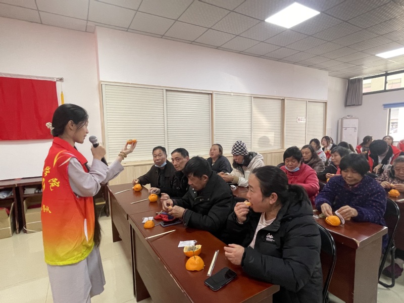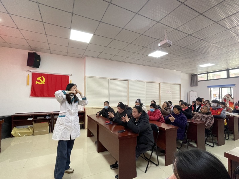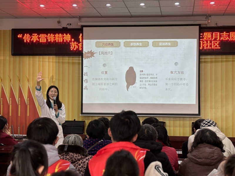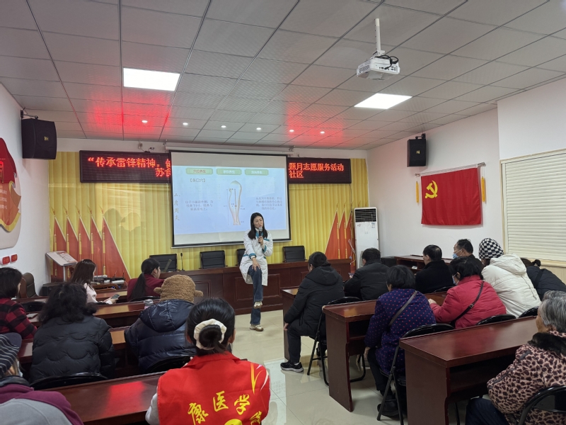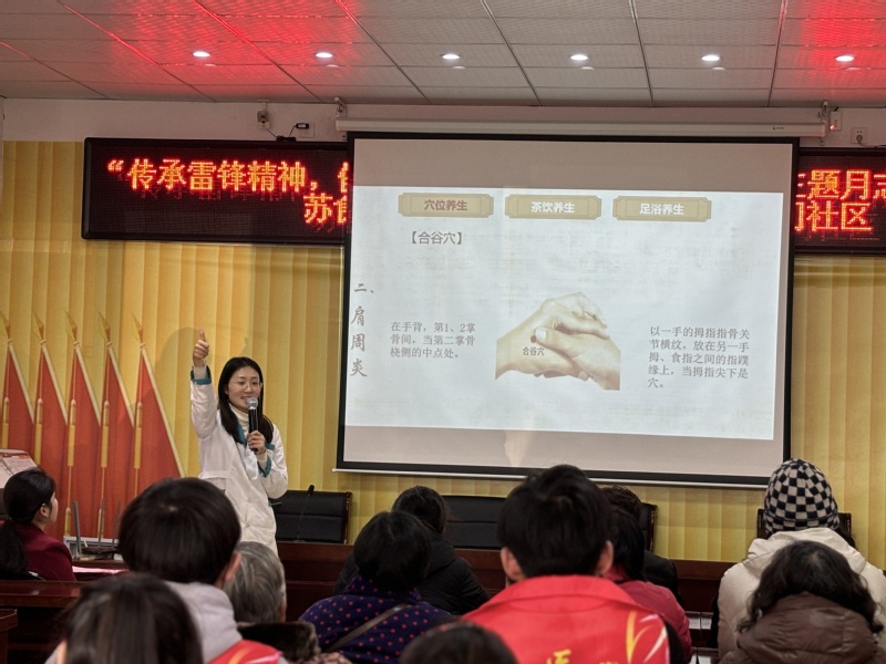 首先是春“锋”护你主题的中医春季养生讲座,由中医养生保健专业邓杰方老师通过“穴位养生、茶饮养生、足浴养生”三部分为社区人员进行养生讲解。实践出真理,进行“穴位养生”讲解时,邓老师为大家演示了简便取穴的诀窍,并让现场的人员跟着她一起按压相应的养生穴位。接着又为大家讲解两款适合春季养生的茶饮,一款功效在降脂降压,而另一款的功效是具有补气健脾改善脾虚湿邪内阻的减肥茶。在讲解足浴养生时,邓老师特别嘱咐大家一些泡脚的注意事项,从时长、水温、泡脚禁忌以及保暖等问题为大家进行疑难解答。邓老师讲座全程结合了一问一答的形式,字字句句都体现出对社区居民身体健康状况的关心。