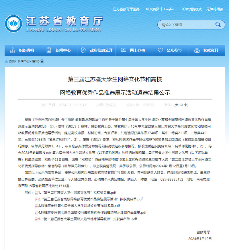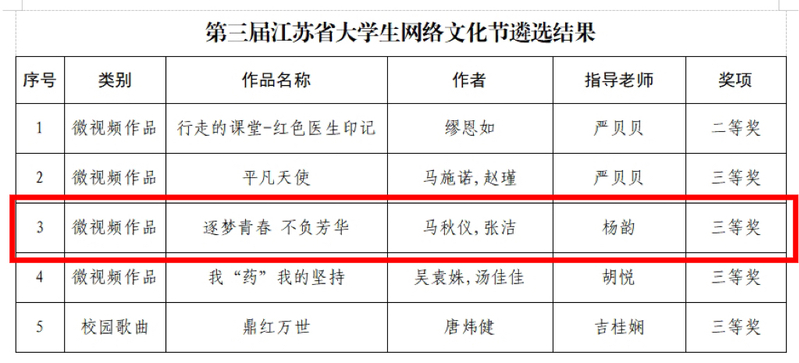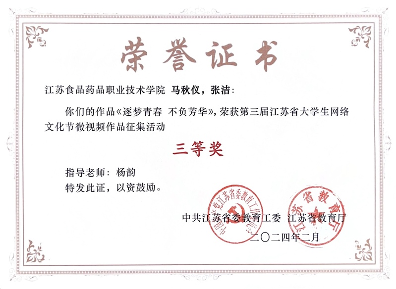 2024年1月12日,江苏省委教育工委、江苏省教育厅公布了第三届江苏省老员工网络文化节和高校网络教育优秀作品推选展示活动遴选结果。公司杨韵老师指导的作品《逐梦青春 不负芳华》荣获第三届江苏省老员工网络文化节微视频作品征集活动三等奖,康复222班:马秋仪、张洁两位员工作为主要演员参与作品拍摄。