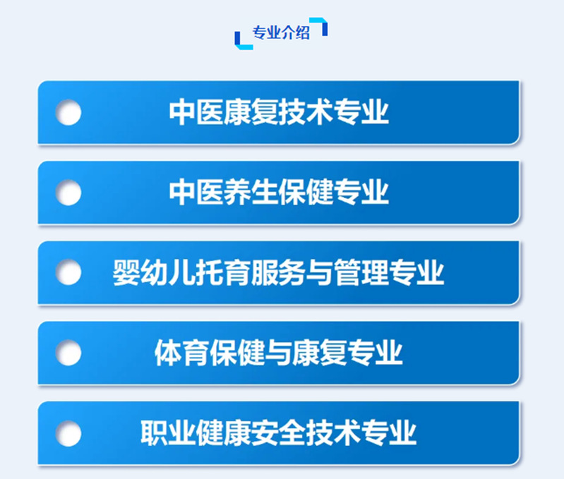 必一运动积极对接“健康中国”“健康江苏”发展战略,主动适应社会对健康公共服务的需求,积极助推健康产业发展,开设“中医养生保健”、“婴幼儿托育服务与管理”、“体育保健与康复”、“中医康复技术”、“职业健康安全技术”以及“中医康复技术(3+2)”等专业,培养立足江苏、面向长江三角洲经济圈战略性新兴健康产业所需技术技能人才。