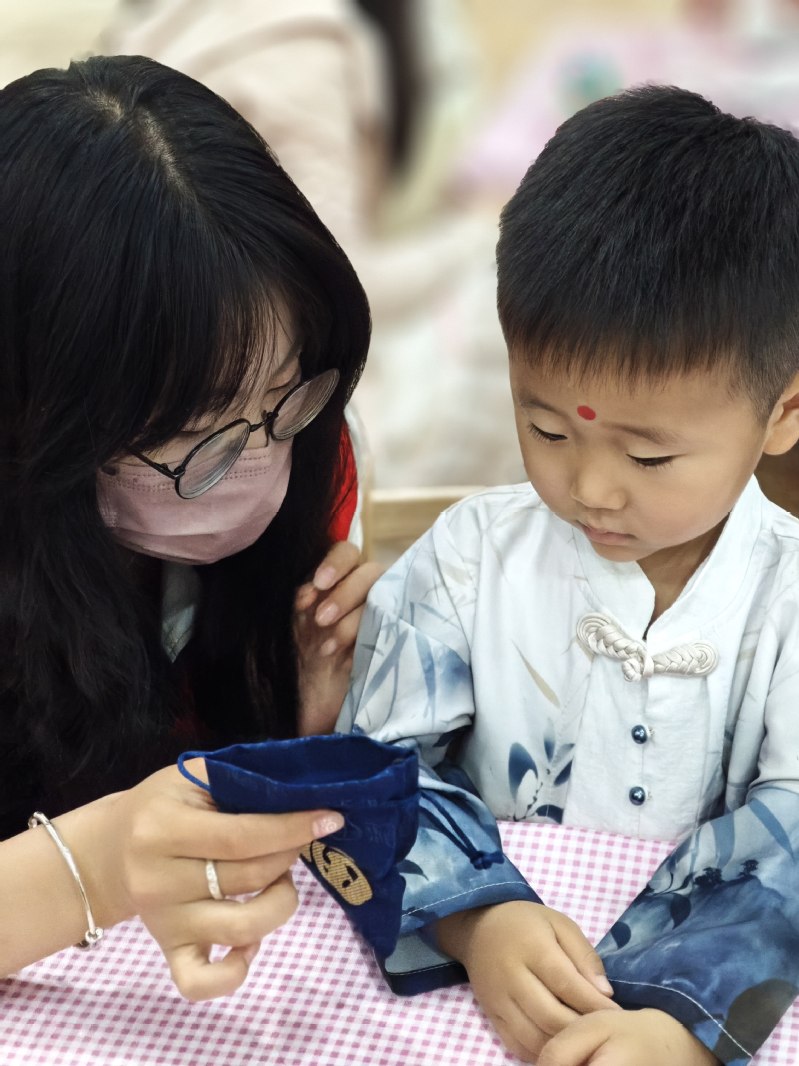 活动伊始,社团同学们化身传统文化的传递者,为孩子们系上五色缕。色彩斑斓的丝线轻轻缠绕在孩子们的手腕上,寓意将好运紧紧“缠”住,也寄托着对孩子们健康成长的美好祝愿。随后,同学们以生动有趣的方式,向孩子们讲述端午节的历史渊源,分享小儿防病养生的中医小知识。紧接着,中药香囊制作环节将活动推向一个小高潮。在同学们的耐心指导下,孩子们小心翼翼地将艾叶、丁香等中药材装入精美的香囊袋中。随着一针一线的穿梭,一个个造型别致、香气四溢的中药香囊新鲜出炉。这些香囊不仅是端午的特色饰物,更承载着传统中医药文化的智慧。